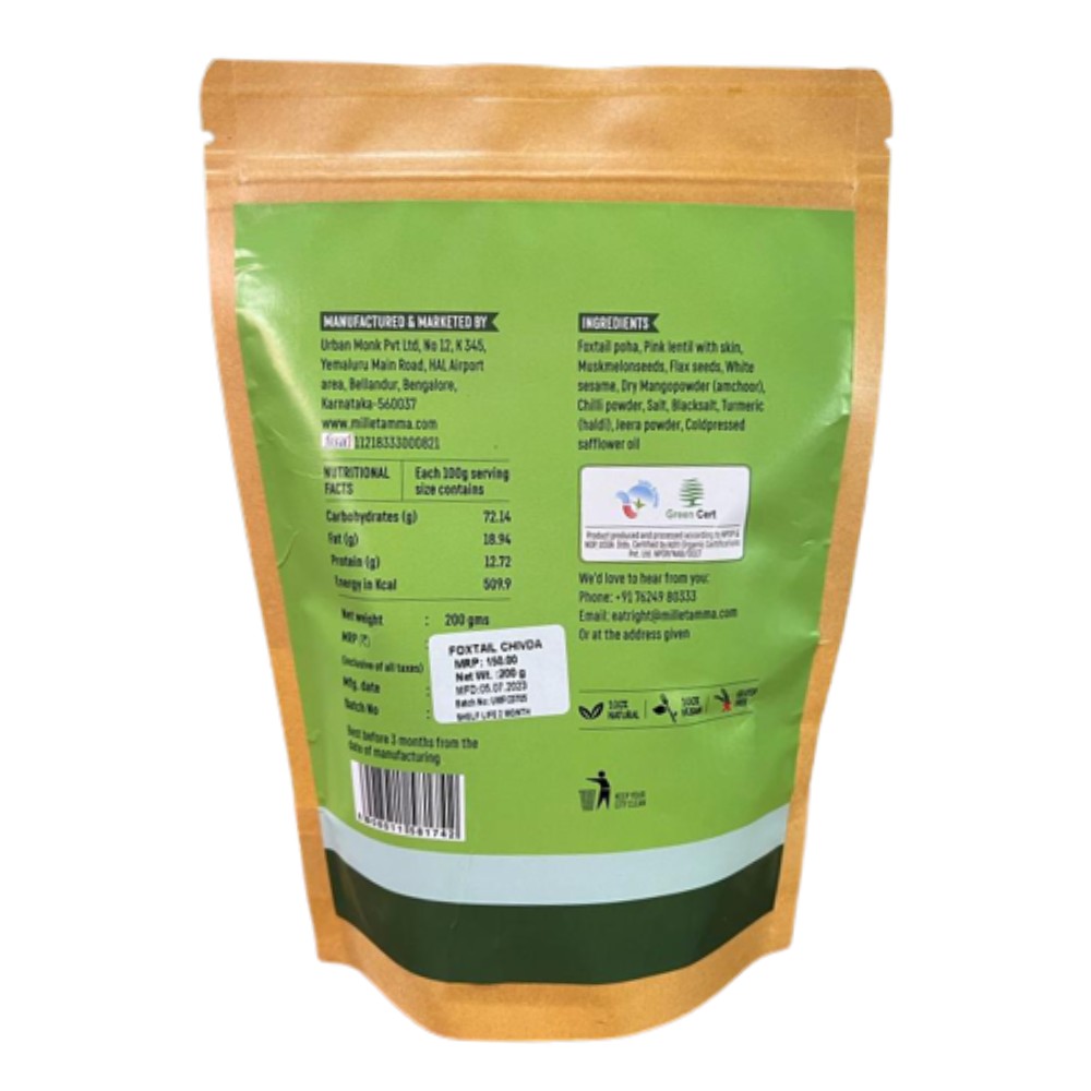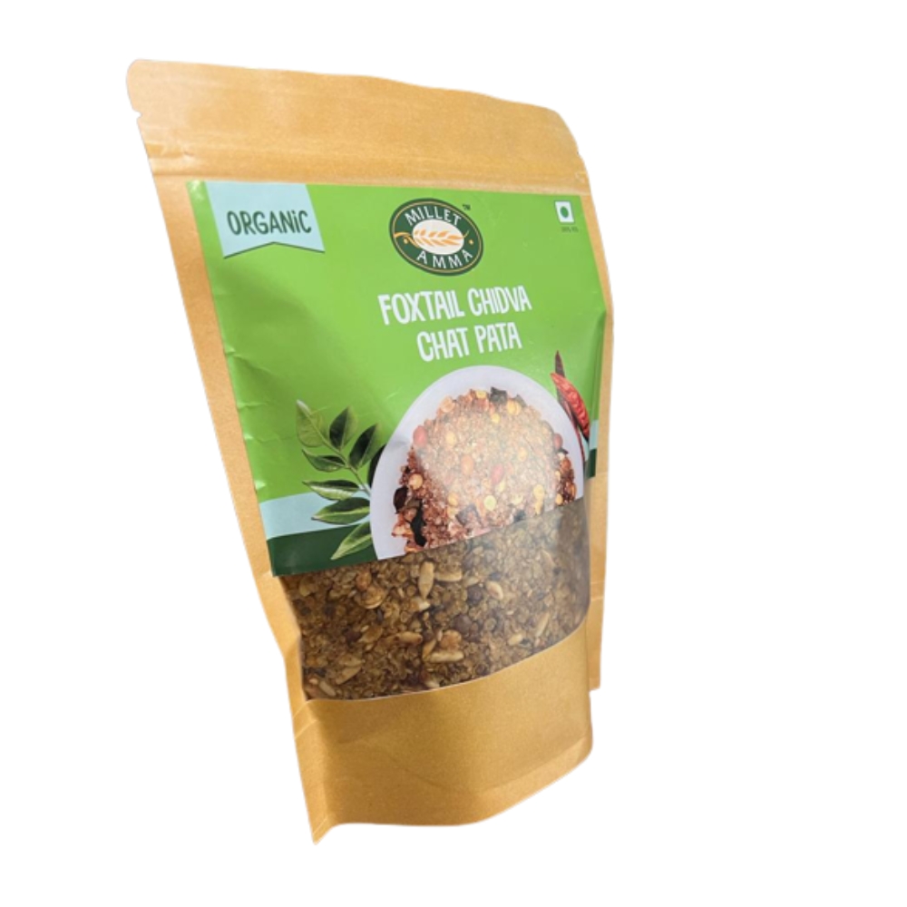 Foxtail Millet chidva (chat pata) is a healthy snack high in protein (12%); fiber content (8%) and iron (6.3%). Part of the famous 5 positive millets, a tasty and nutritional snack alternative 100% organic and vegan Gluten-free High in energy 509.9