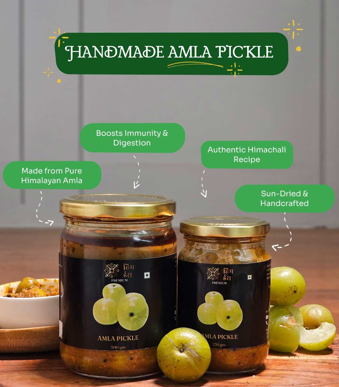 HimIra’s handcrafted Amla Pickle (आंवला अचार) is a perfect balance of sour, spicy, and slightly sweet flavors, made using the finest Himalayan-grown amla. Rich in vitamin C, antioxidants, and probiotics, this traditional achar enhances your meals while supporting immunity and digestion. The amla (Indian gooseberry) is carefully sun-dried and preserved in cold-pressed mustard oil, allowing the flavors to develop naturally while keeping the nutritional value intact.