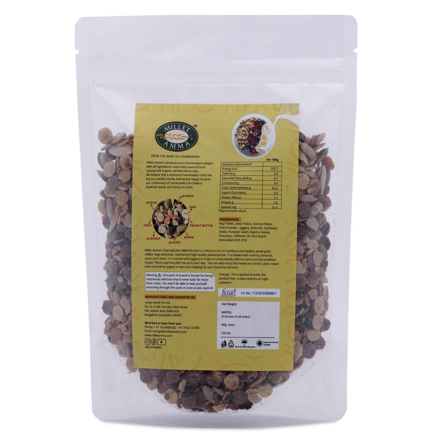 Millet Amma’s Peanutbutter Millet Muesli is not only healthy but also nutritious and delicious. Nutty muesli made with Jowar, Ragi, Quinoa, Fruit, Nuts and Seeds is full of wholesome ingredients that make this mix a delicious way to get your daily dose of nutrients. This natural and gluten-free breakfast muesli is loaded with crunchy roasted almonds, sunflower seeds, pumpkin seeds, flaxseeds and delicious raisins- which are then tossed with peanut butter honey and jaggery. Look no further for a healthy munching option during your tiring busy day- this is a perfect pick-me-up to your day. Contains 51% millets, Contains Nuts and Real Fruit (36%), No Refined Sugar, Gluten-Free , Zero cholesterol Made in Small Batches to ensure Quality & Freshness
