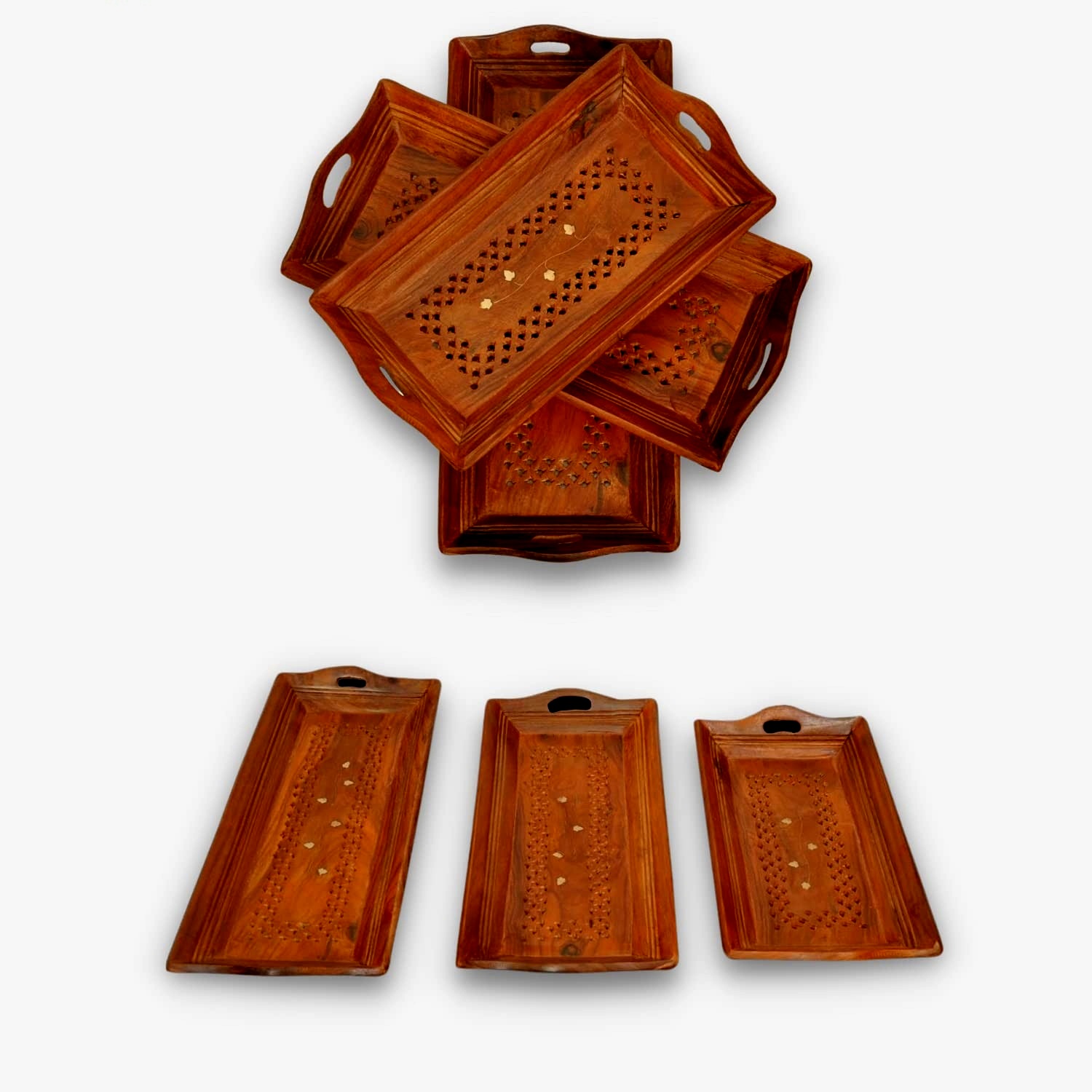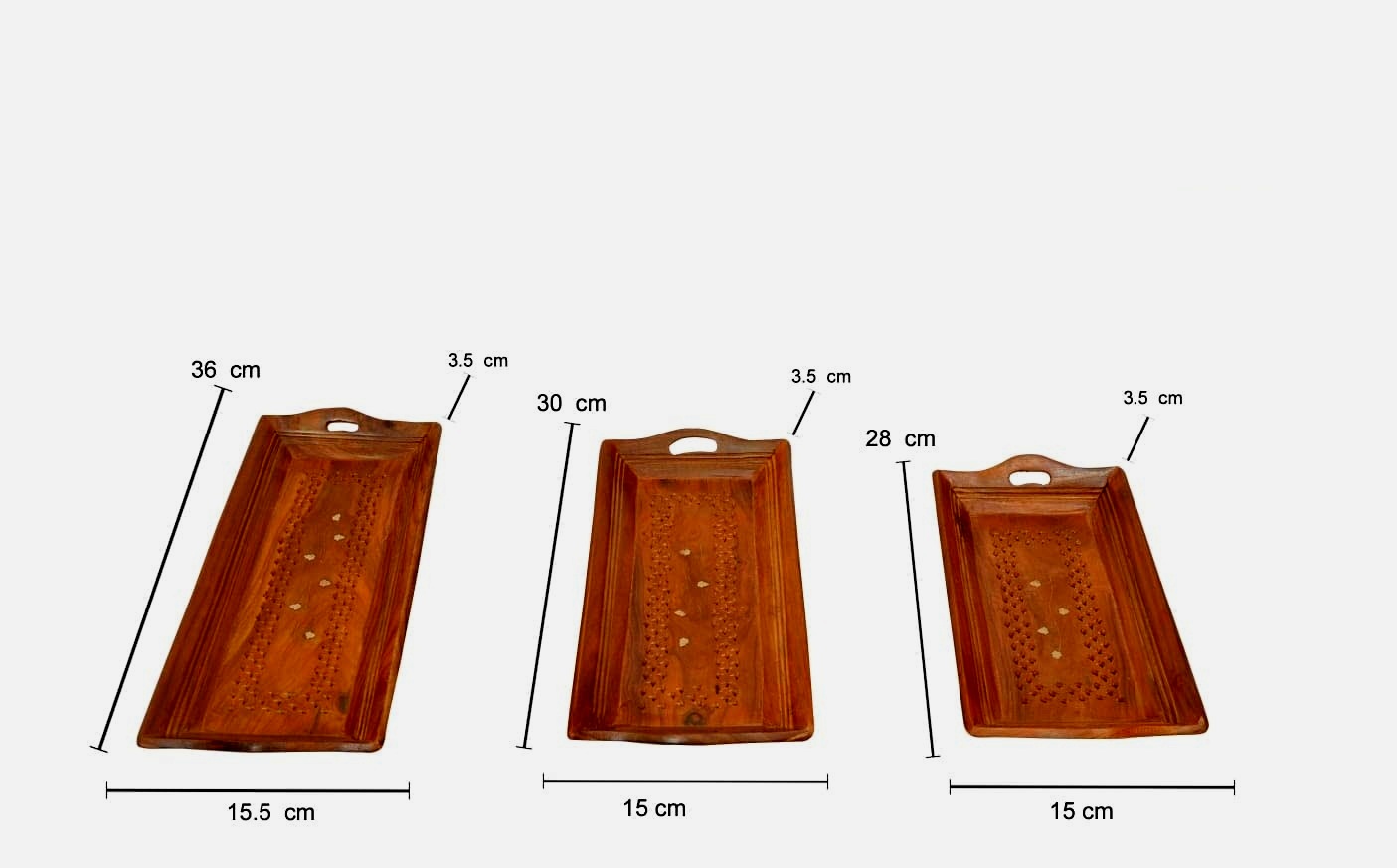 Sheesham Wood Crafts Wooden Coffee / Food Serving Tray (Brown) Set of 3 made of pure Sheesham Wooden tray with superior quality material used, It is a beautiful design tray unique 3 you can use as per your requirement. Product Measurement: Small :-11.5*6 , Medium:- 13.5*6, Large :- 15.5*6 . Hand carved wood exterior, Daily use product for kitchen. It is a multi-purpose tray for daily use and can be used as snack tray, drinks tray, kitchen tray, appetiser tray, nesting tray, home decor displays, party platter and trays. It is considered for daily use and can be used as snack tray, drinks tray, kitchen tray, appetizer tray, nesting tray, home decor displays, party platter and trays
